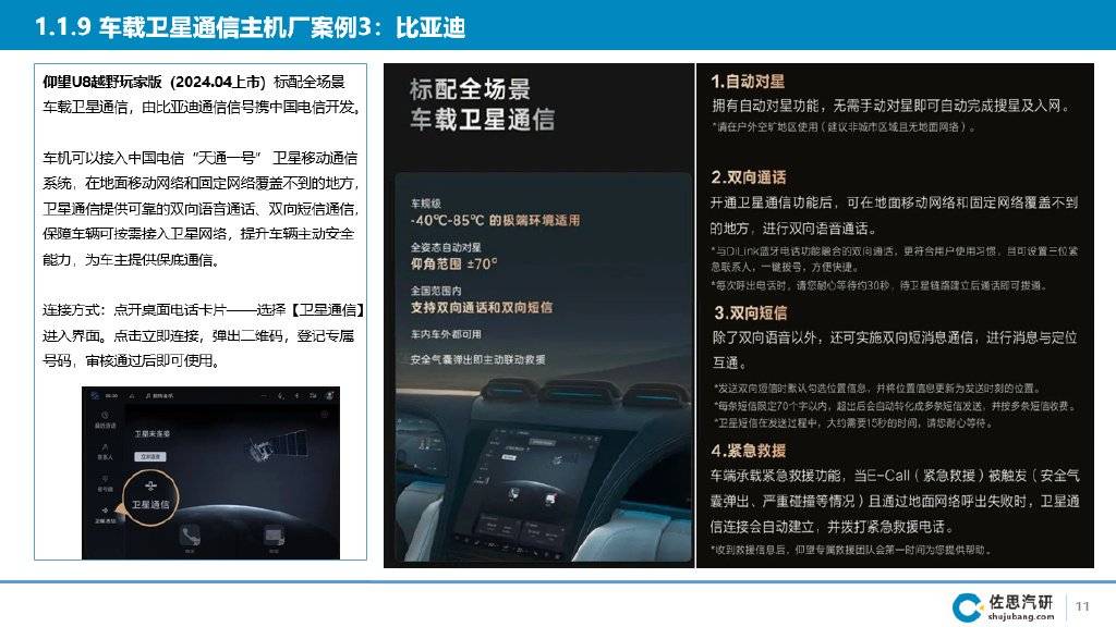 仰望 U8 越野玩家版标配全场景车载卫星通信,由比亚迪通信信号携中国电信开发。车机可以接入中国电信“天通一号” 卫星移动通信系统,在地面移动网络和固定网络覆盖不到的地方,卫星通信可提供双向语音通话、双向短信通信,保障车辆按需接入卫星网络,提升车辆主动安全能力。